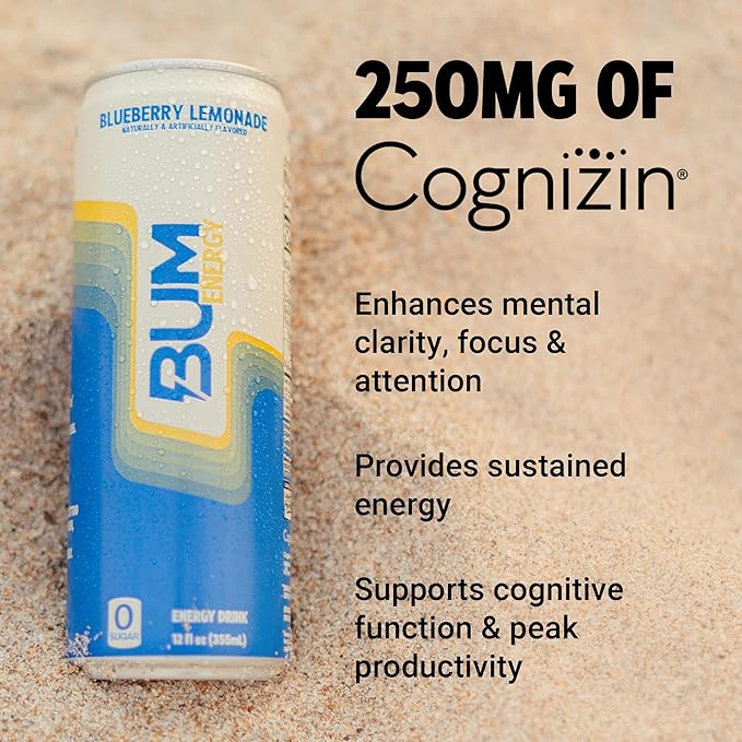 - Blueberry Lemonade Bum Energy Drink: Crack open a can of Bum Energy and channel your untapped potential. Made with stimulating natural caffeine and brain-boosting Cognizin, a dynamic duo that will deliver clean energy and sharpened focus. 12-pack of 12-oz cans.
