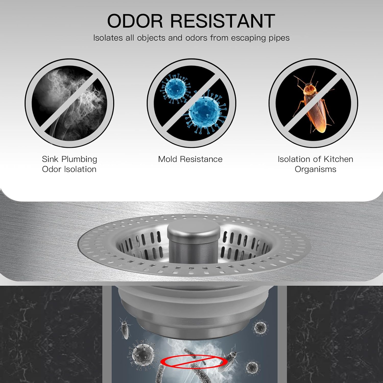- 3-in-1 Kitchen Sink Strainer and Stopper: One item, three Functions. The kitchen sink plug combo has the functions of storing and draining water, filtering and keeping odors out. Sink stopper helps to save water while washing dishes, a sink filter basket to collect food scraps when draining, ⚠️Note: Suitable for deep sinks