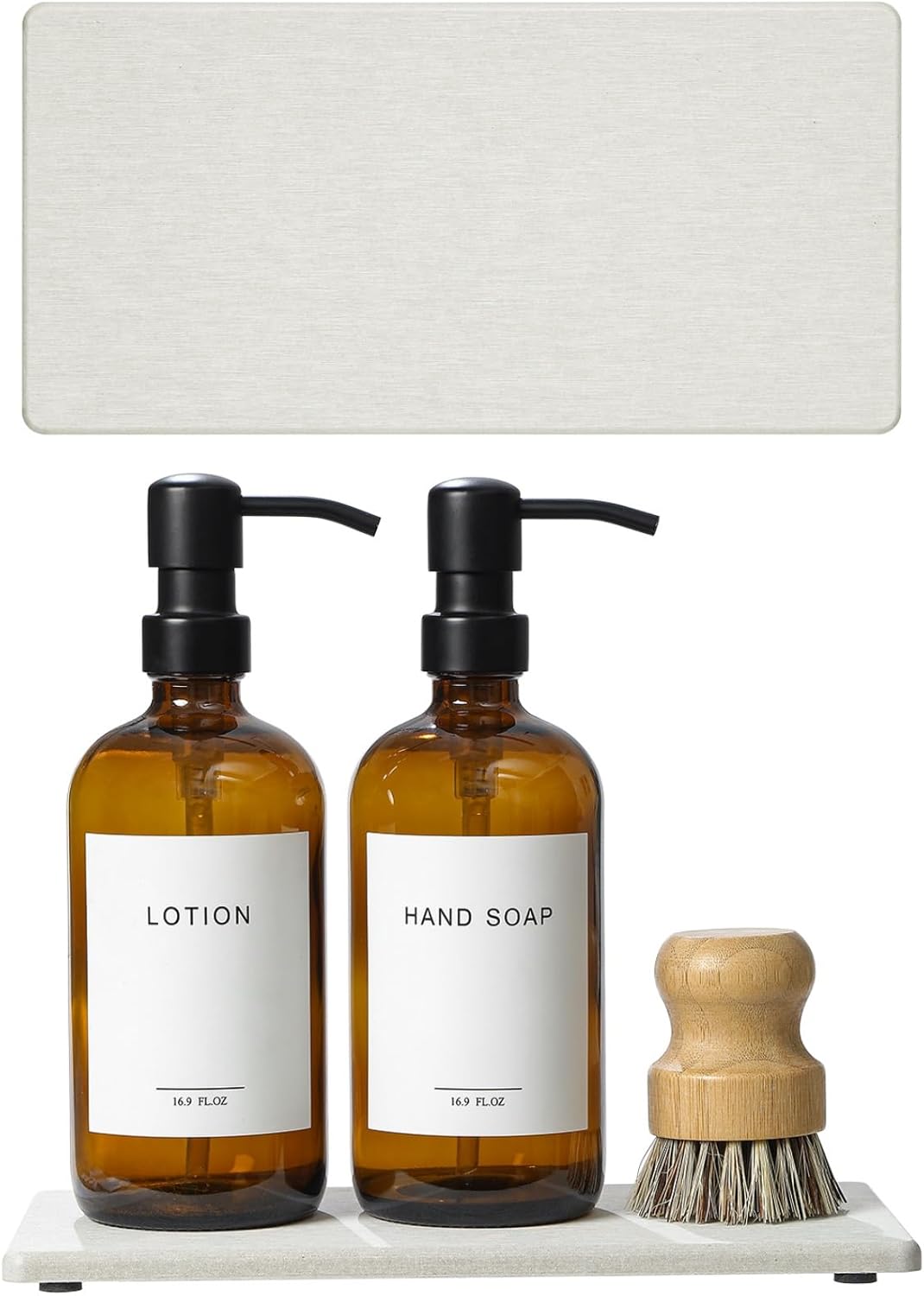 2PCS 10"x 5" Large Bathroom Sink Vanity Trays, Water Absorbing Diatomite Stone Quick Drying Mat for Kitchen Counter, Dish Rack Dispensers Sponge Holder Caddy Organizer, Beige, 10"x 5"