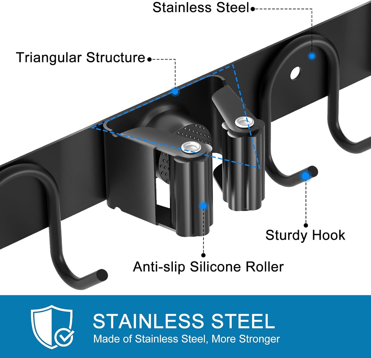 - Premium Stainless Steel Broom Holder: Built with ultra-durable, rust-proof stainless steel for exceptional strength and longevity. Resists damage and thrives in damp environments, no breakage worries