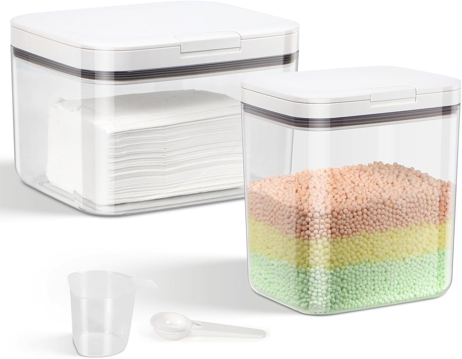 2 Pack Laundry Pods Container with One-Click Pop-up Lid, 95 oz + 68 oz Laundry Room Detergent Storage Container for Laundry Powder, Scent Booster, Dryer Sheet, Dryer Ball, Dishwasher Pod Holder
