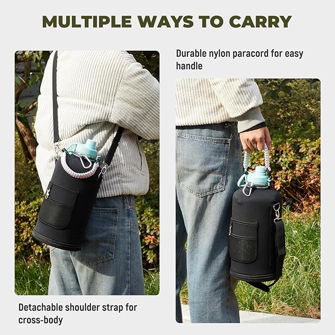 - Iconic Paracord Handle and Carrying Pouch: This insulated water bottle comes with a beautiful hand knit nylon paracord in coordinated color with the water bottle. This paracord handle is a must-have as a full functional camping / hiking flask. And storage carrying pouch with removable shoulder strap for convenient hands free carrying! The safe zippered pocket design to stores all your stuff, holds your cards & phone & key