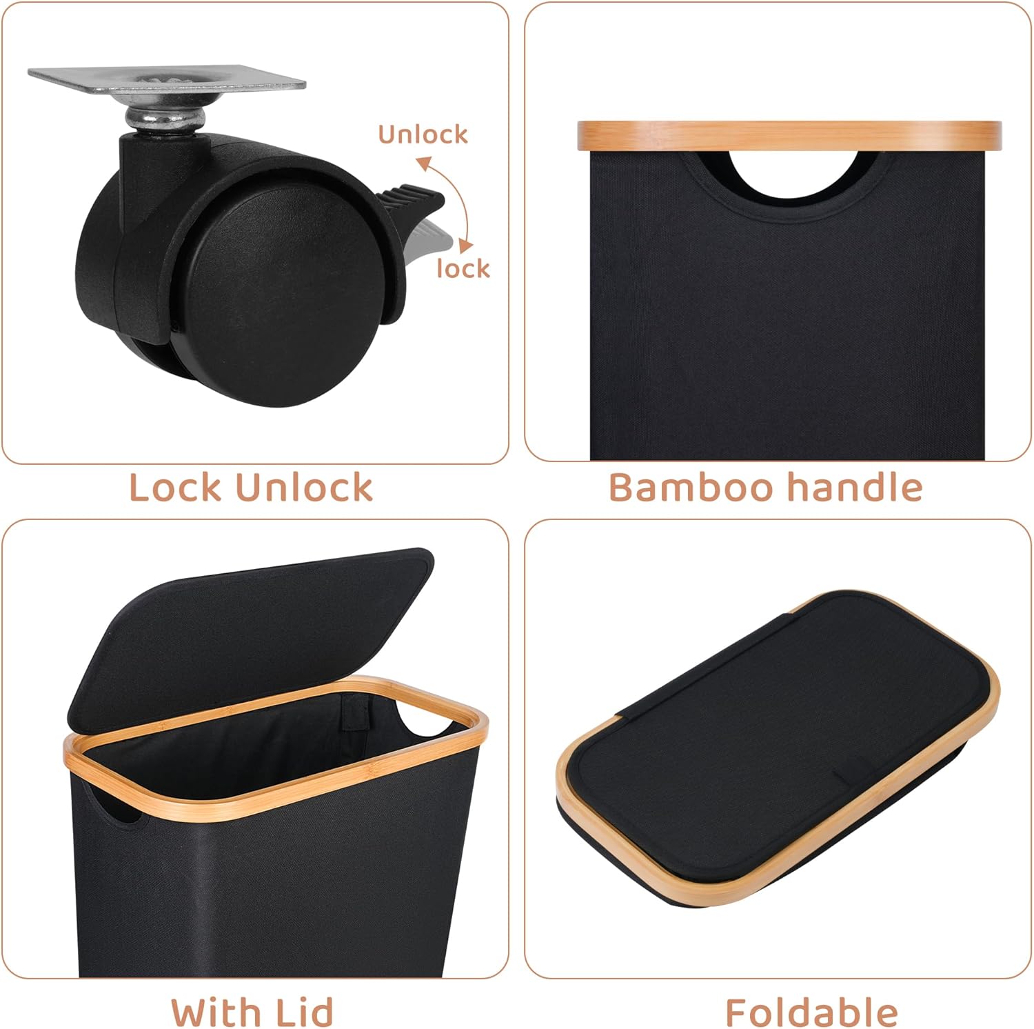 Slim Laundry Hamper with Wheels,Narrow Hampers for Laundry,Freestanding Laundry Basket with Lid&Bamboo Handles,Collapsible & Waterproof Tall Cloth Hamper for Dorm Family(60L,Black)