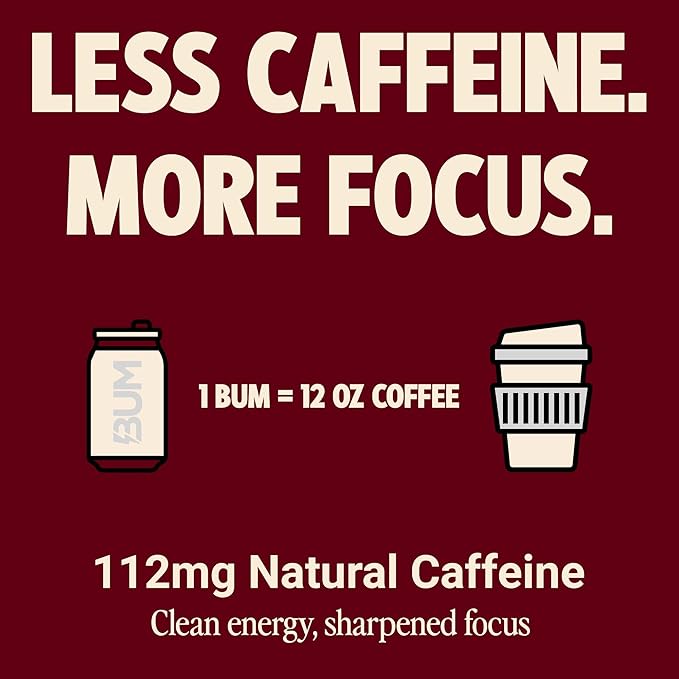 - Keep It Clean: Leave the drinks that contain a laundry list of ingredients in the past. Bum Energy contains just two simple ingredients, 112mg of Caffeine & 250mg of Cognizin. Made with zero sugar and no artificial colors, every sip unlocks pure, untapped potential.