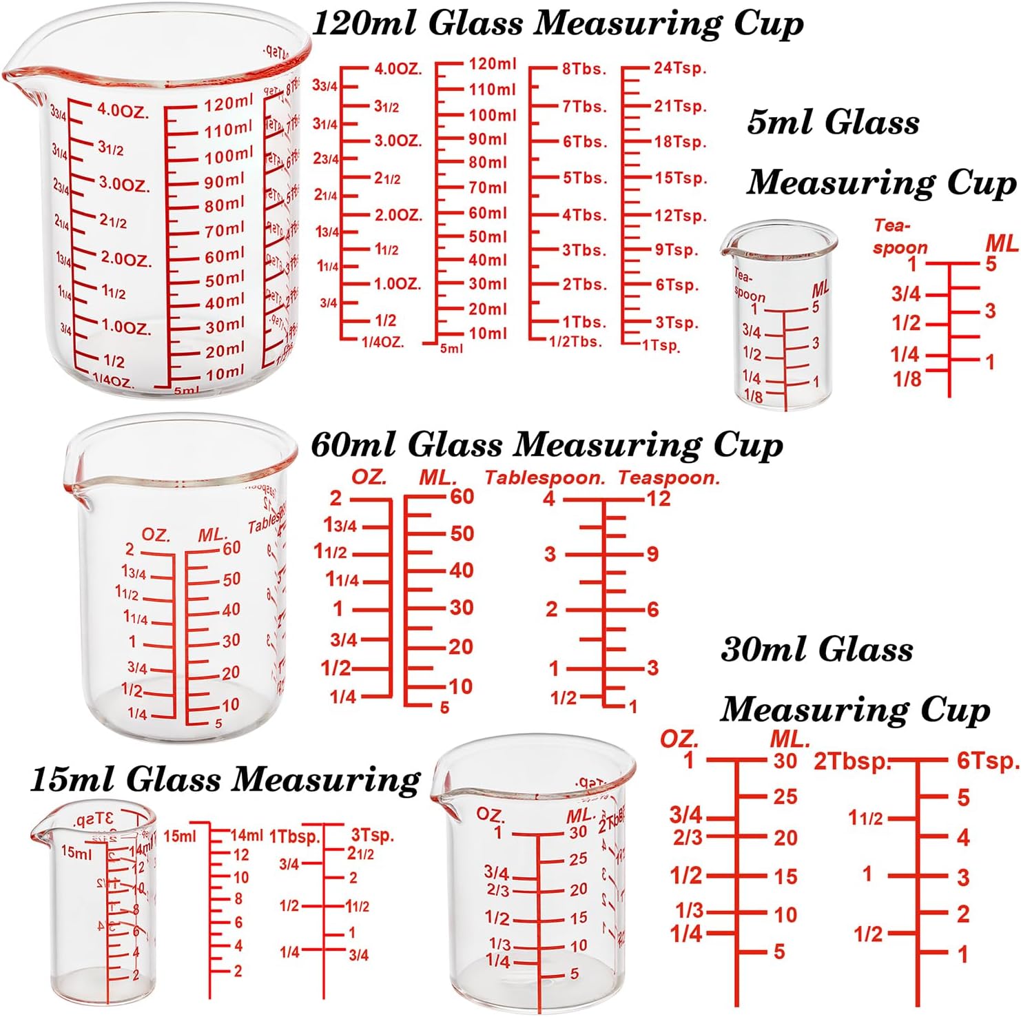 - Complete Measuring Beaker Set – Includes 7 glass beaker measuring cups: 1 tsp (5ml), 1 tbsp (15ml), 1oz (30ml), 2oz (60ml), 4oz (120ml), 5oz (150ml), and 8oz (250ml), covering all baking, cooking, and drink preparation needs