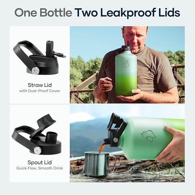 - 2 Caps Pack: This 128 oz stainless steel water bottle comes with straw lid and flex cap, the flex cap is perfect for the beach, camping and hiking, while the straw lid is suitable for cycling and road trip