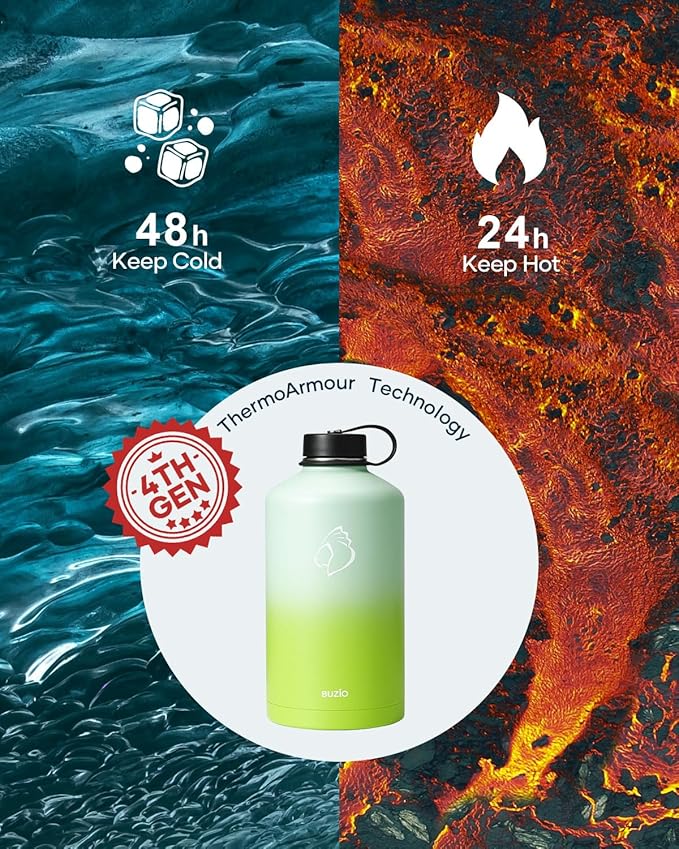 BUZIO 128oz Gallon Water Bottle, Insulated Water Jug with Straw Lid and Carrying Sleeve (Cold for 48 Hrs) Stainless Steel Hydro Metal Canteen Water Flask, Gradient Green