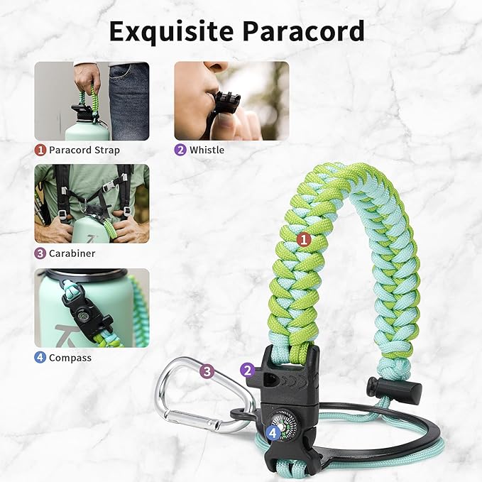 - Full-function Paracord Handle: Brilliant paracord of matching colors bring out the bottle with a touch of youthful vibe. Compact compass and handy carabiner make the bottle the ideal survival kit for expeditions in the wild.