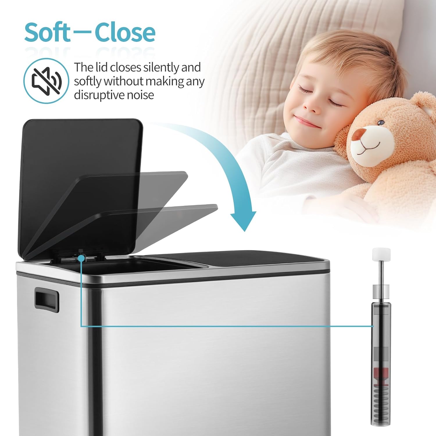- 2 Slow-Down Lids: Kitchen trash can with lid made of ABS plastic is designed with slow-down. Slow-down lids can keep the recycle bins for kitchen silent and reduce wear. At the same time, the lids have locks that can keep the dustbin open when in use