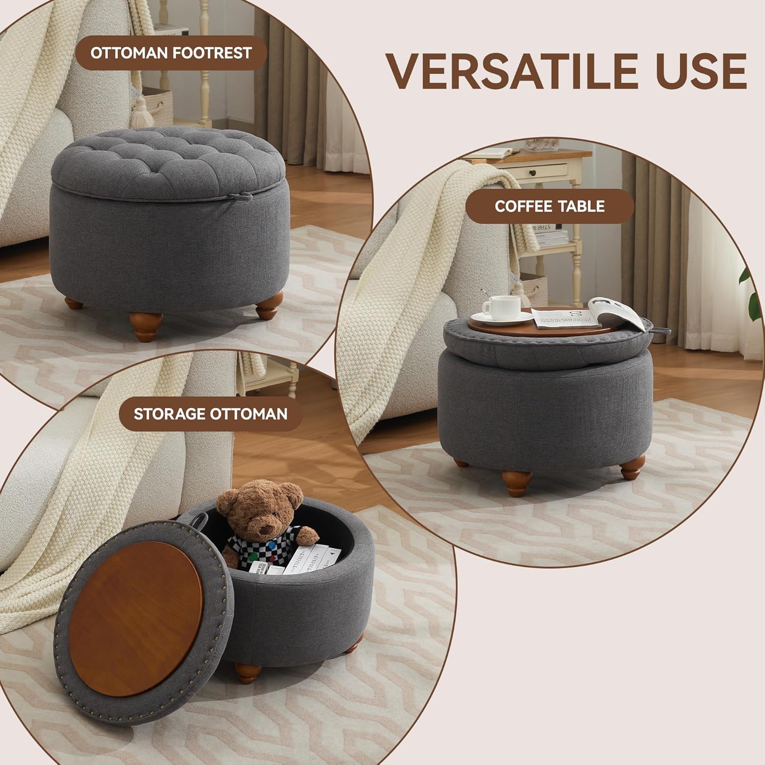 - Premium Material:Circle ottoman is made of high-quality linen fabric, which is soft and breathable. The wooden cover has a natural texture and a smooth and waterproof surface. It can be used as a coffee table, had a fine craftsmanship, simple design, and spacious storage space, combining beauty and practicality.