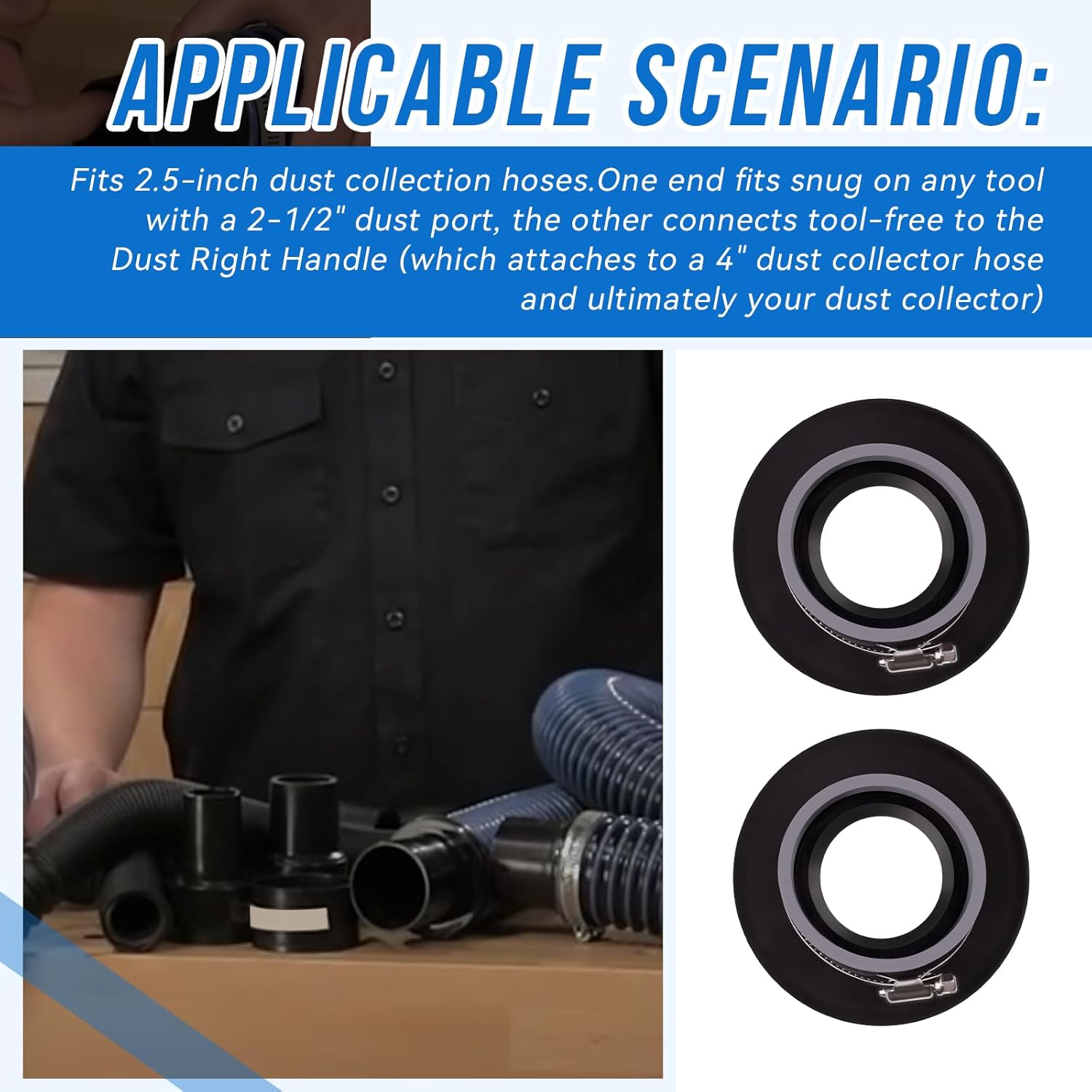 - APPLICABLE SCENARIO: Fits 2.5-inch dust collection hoses.One end fits snug on any tool with a 2-1/2" dust port, the other connects tool-free to the Dust Right Handle (which attaches to a 4" dust collector hose and ultimately your dust collector)