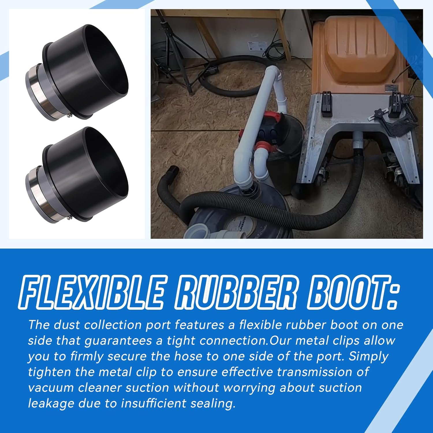 - FLEXIBLE RUBBER BOOT: The dust collection port features a flexible rubber boot on one side that guarantees a tight connection.Our metal clips allow you to firmly secure the hose to one side of the port. Simply tighten the metal clip to ensure effective transmission of vacuum cleaner suction without worrying about suction leakage due to insufficient sealing
