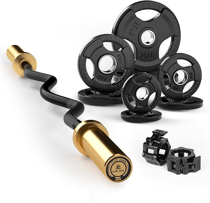 - All In One Kit to Meet Your Needs: We’re dedicated to providing convenient and effective workout solutions for all. Get this EZ curl bar and weight plate set and experience a targeted and challenging workout that activates your biceps and triceps the way they’re supposed to. Shipped in TWO packages, this set includes an EZ curl bar with golden titanium-plated sleeves & black E-coated shaft and pairs of 2.5lb, 5lb and 10lb 2-inch rubber coated Olympic weight plates, all the plates totaling 85 pounds. Please notice the pair of 25lb plates is shipped separately. Barbell clamps are included.