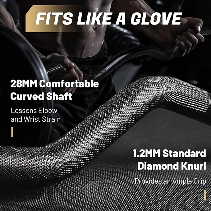 - Comfortable Curved Shaft with Standard Knurling: The bent shaft of our curl bar is designed for maximum comfort and effectiveness. The thoughtfully crafted cambered angles place your hands in a natural position, significantly reducing strain on your elbows and wrists. And 1.2mm standard diamond knurl provides an ample and superior grip for any movement from curls to rows even with sweaty hands.