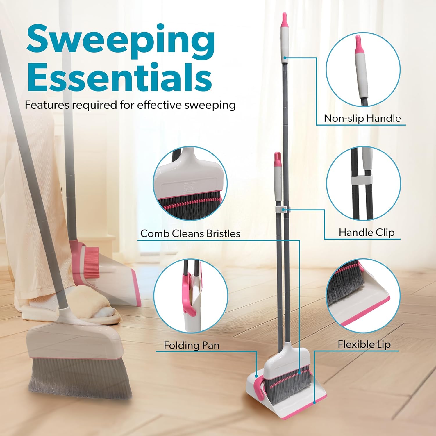 BLACK+DECKER Butler Broom & Dustpan Set - Stand-Up Design - Lightweight, Space-Saving Combo for Kitchen, Living Room, Bathroom, Lobby Floors - Home Cleaning Essential, White/Pink