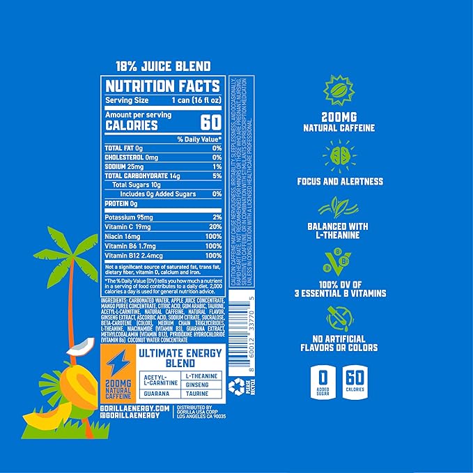 - REAL FRUIT JUICE SQUEEZED, THEN CONCENTRATED: Each sip bursts with natural flavors, using real fruit juice that’s squeezed and then concentrated for an authentic taste. With no artificial flavors or colors, clean ingredients, and only 60 calories per can, Gorilla Energy offers a light, refreshing and carbonated way to recharge.