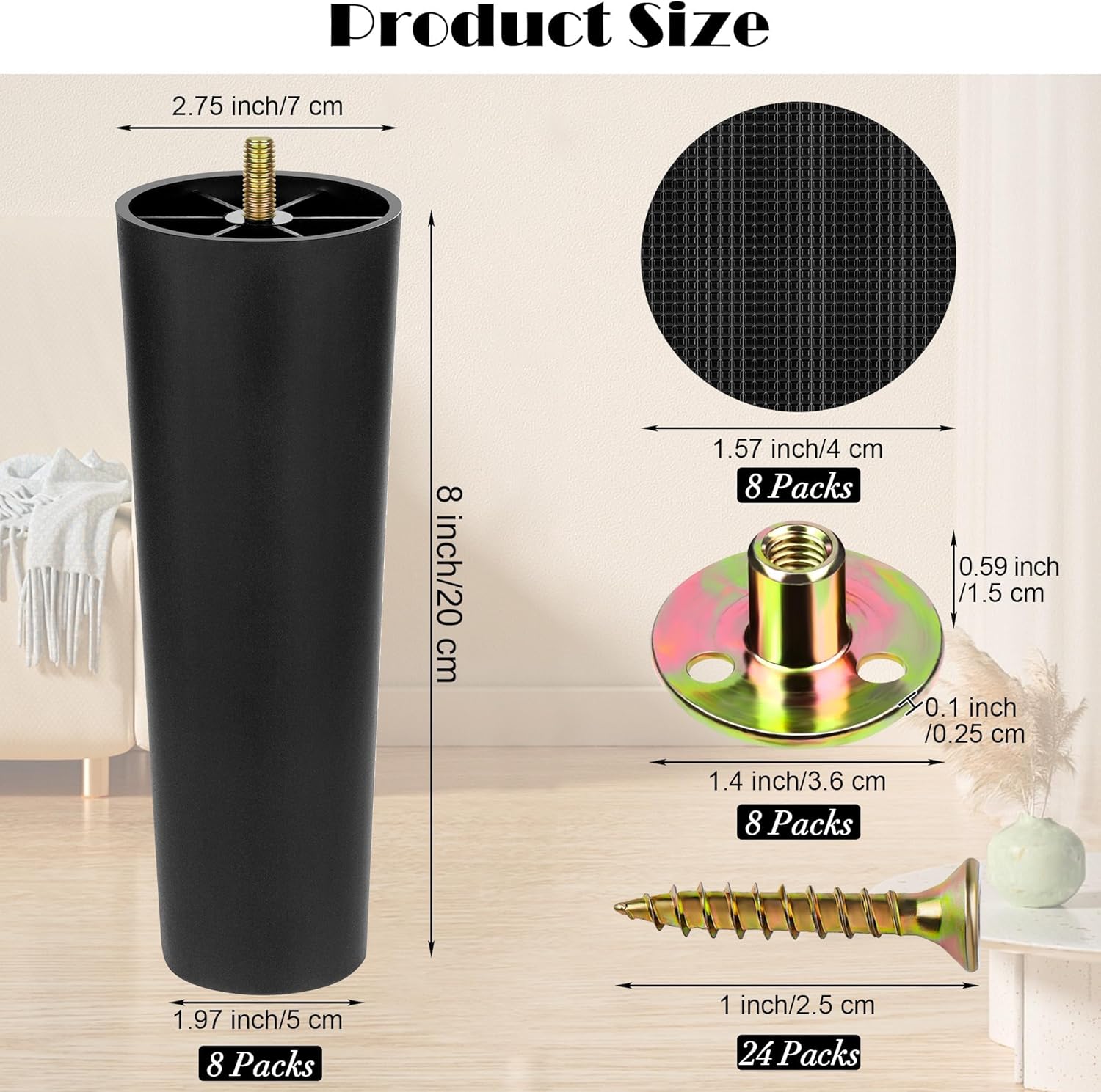 - Dimensions: each sofa leg measures about 2.75 x 1.97 x 8 inches/7 x 5 x 20 cm, screw protrusion 0.75 inches/1.9 cm, each M8 T-nut is 1.4 inches/3.6 cm in diameter, 0.1 inches/0.25 cm in thickness, and 0.59 inches/1.5 cm in height; each screw is 1 inch/2.5 cm in length; each anti-skid pad is 1.57 inches/4 cm in diameter and 0.08 inches/2 mm in thickness; please confirm the size you need before purchase