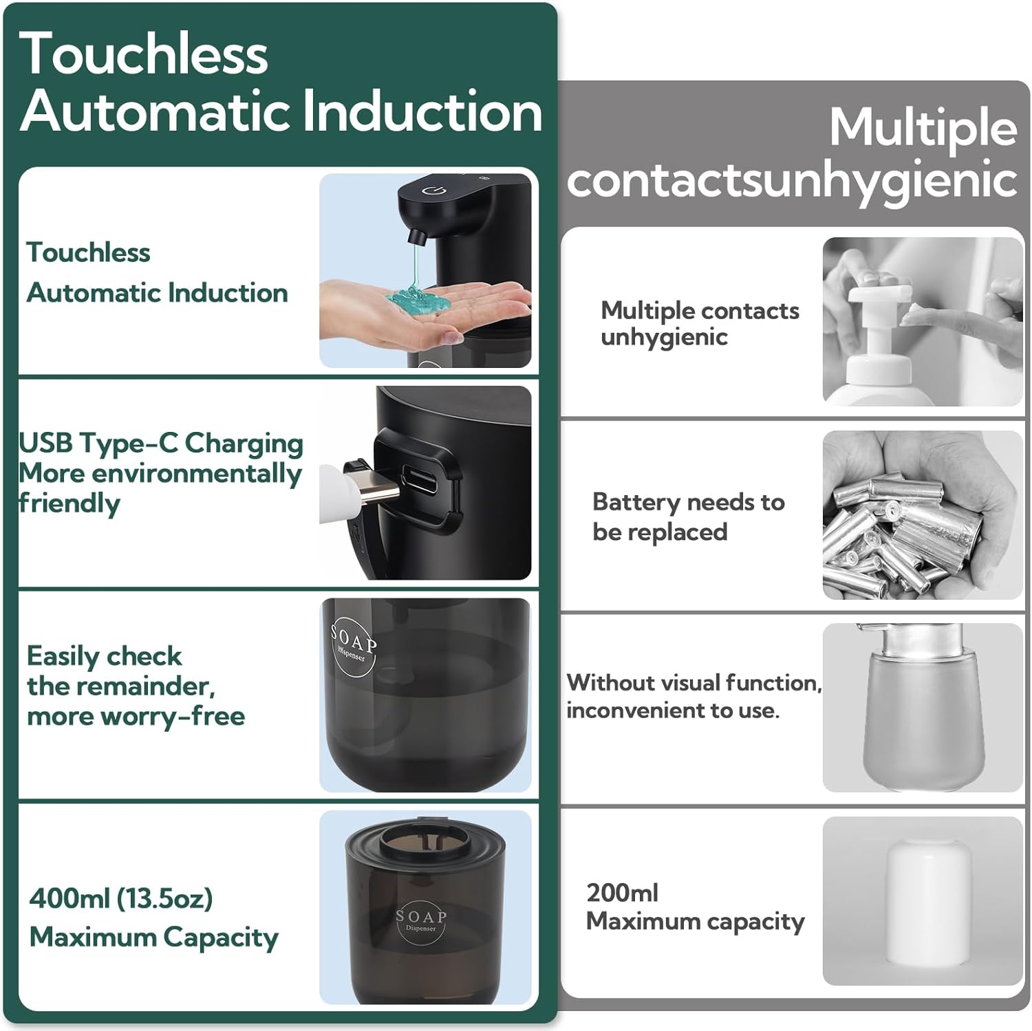 - 【Large Capacity & Long Battery Life】No more disposable batteries! Our foaming soap dispenser features a rechargeable battery, easily powered via USB. Enjoy up to 2-3 months of use on a single charge, depending on usage, for hassle-free, long-lasting performance.