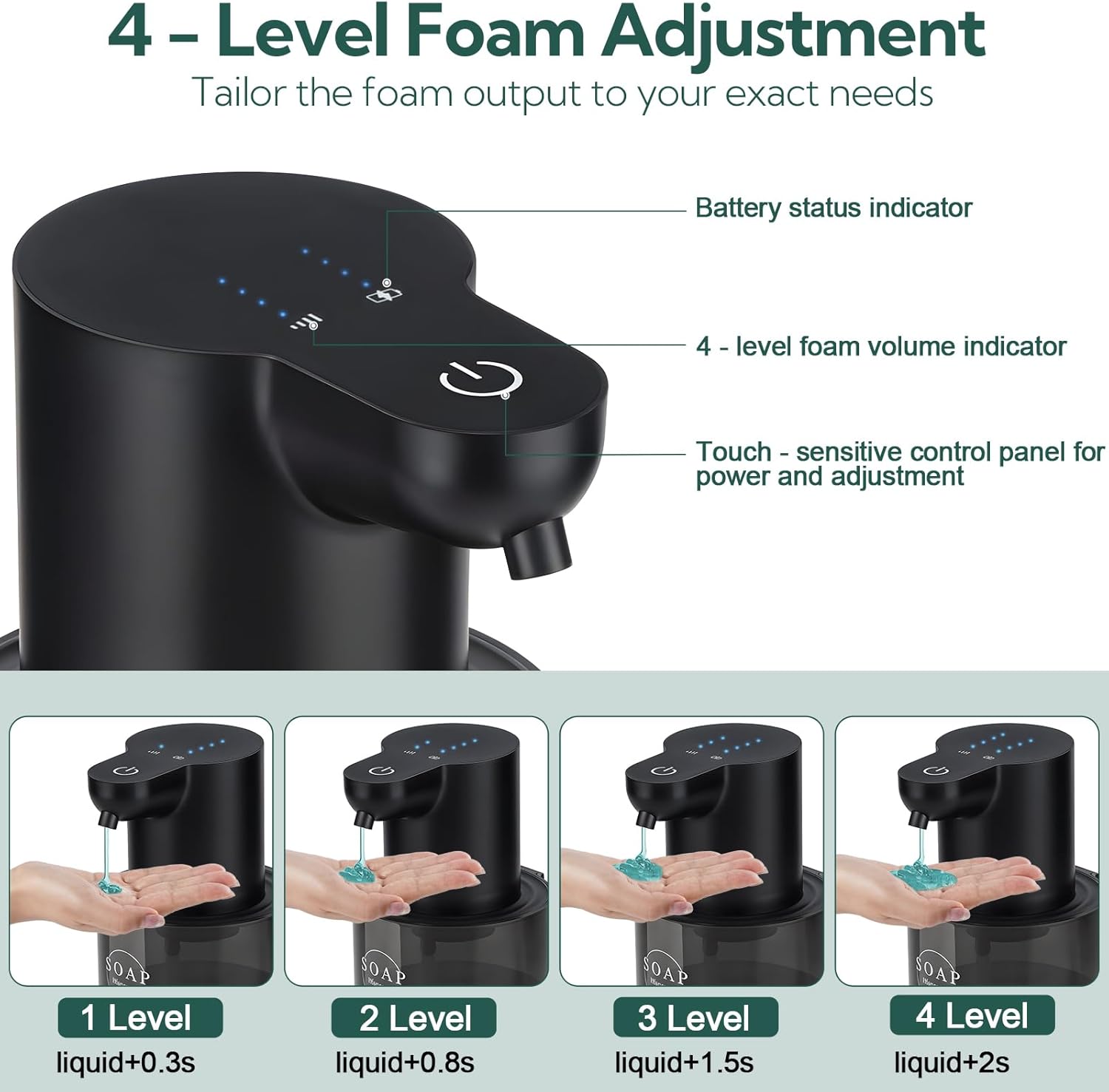 - 【4 Level Adjustable Soap Dispensing】This dispenser features 4 adjustable settings, allowing you to control the soap volume based on your preference. By simply pressing the power button, you can choose the dispensing duration (0.3s, 0.8s, 1.5s, or 2s) to ensure just the right amount of soap, helping to prevent waste.