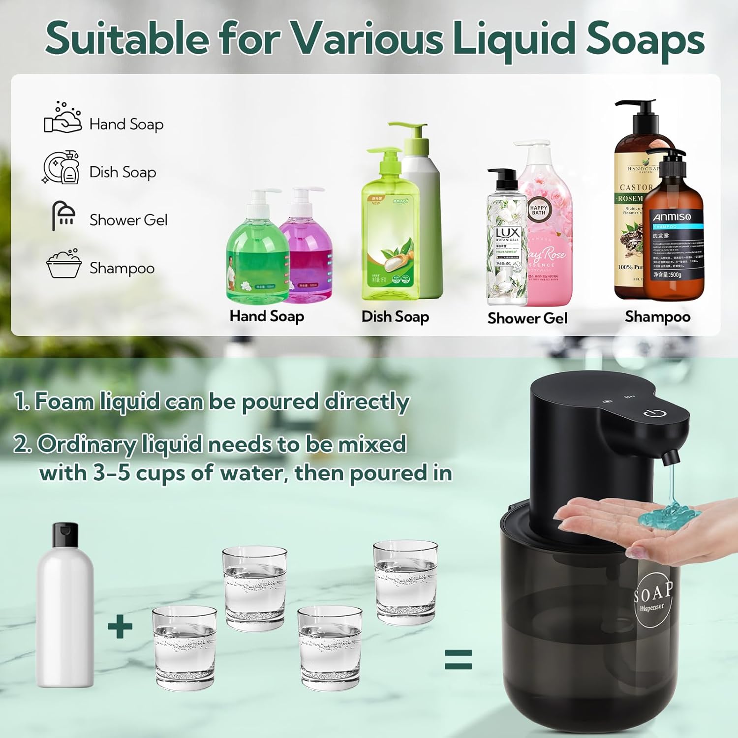 - 【Widely Use Soap Dispenser】This automatic soap dispenser works with dish soap, shower gel, shampoo, hand soap, and facial cleanser. It comes with 4 adhesive wall mounts, offering you the flexibility to either wall-mount it or place it directly on the countertop. Ideal for bathrooms, kitchens, offices, hospitals, hotels, homes, schools, and restaurants.