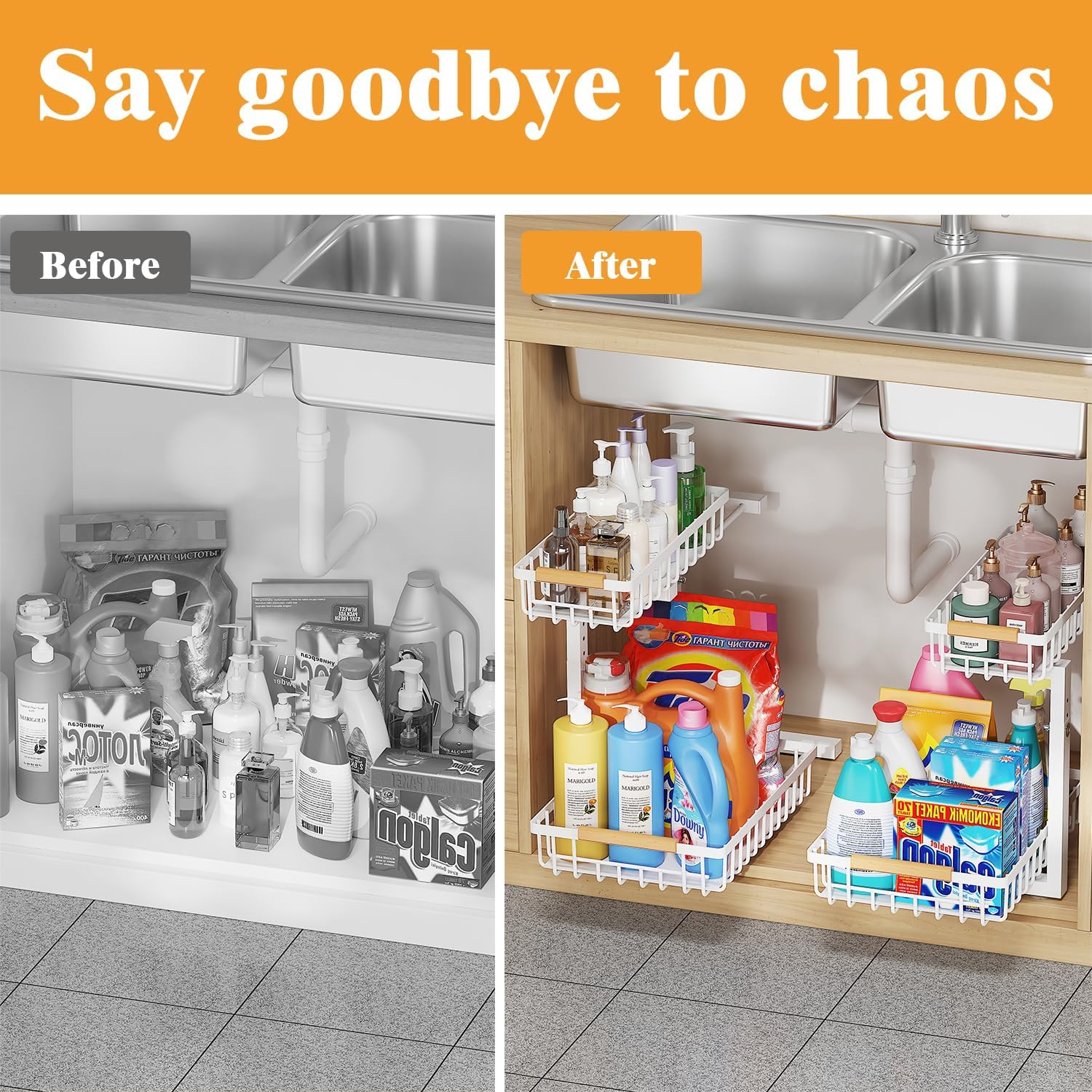 - 2-Tier Pull-Out Storage Baskets: The 2-tier under-sink organizer features smooth sliding rails, ensuring both upper and lower baskets slide out effortlessly without jamming or making noise. The dual-slide functionality makes accessing deep cabinet items easy, especially in deep cabinets.