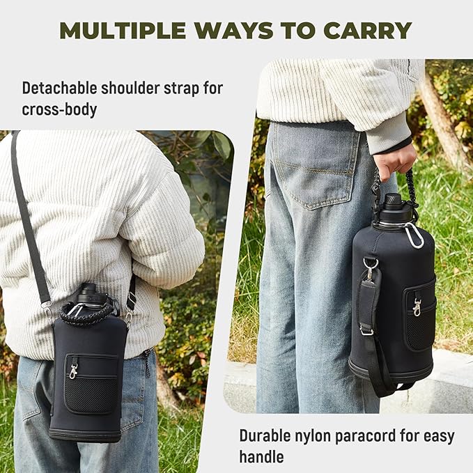 - What’s Included: When you purchase this half-gallon insulated water bottle, you’ll receive 9 premium accessories: Carrying Pouch with Shoulder Strap, Straw Lid with 2 Straws & Straw Brush,Spout Lid, Paracord Handle,Bottle Brush