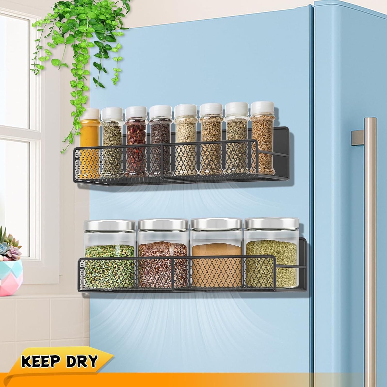 - Strong Magnetic Support – Industrial-grade magnets on the back keep each magnetic spice rack firmly attached to your refrigerator or any metal surface, supporting up to 6–8 lbs without sliding or falling — even when fully loaded