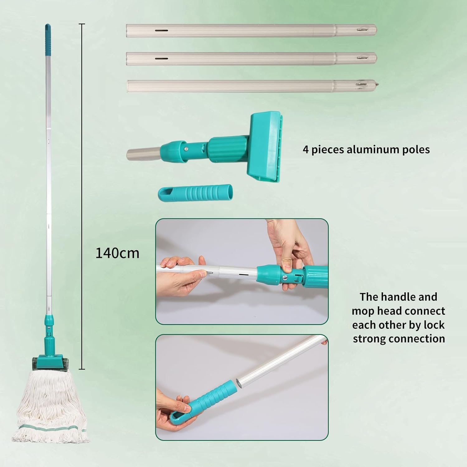 - Material : Bucket PP Bucket +Metal Handle, Mop handle : 4 pieces Aluminum poles, Mop head 50% cotton+50% fiber
