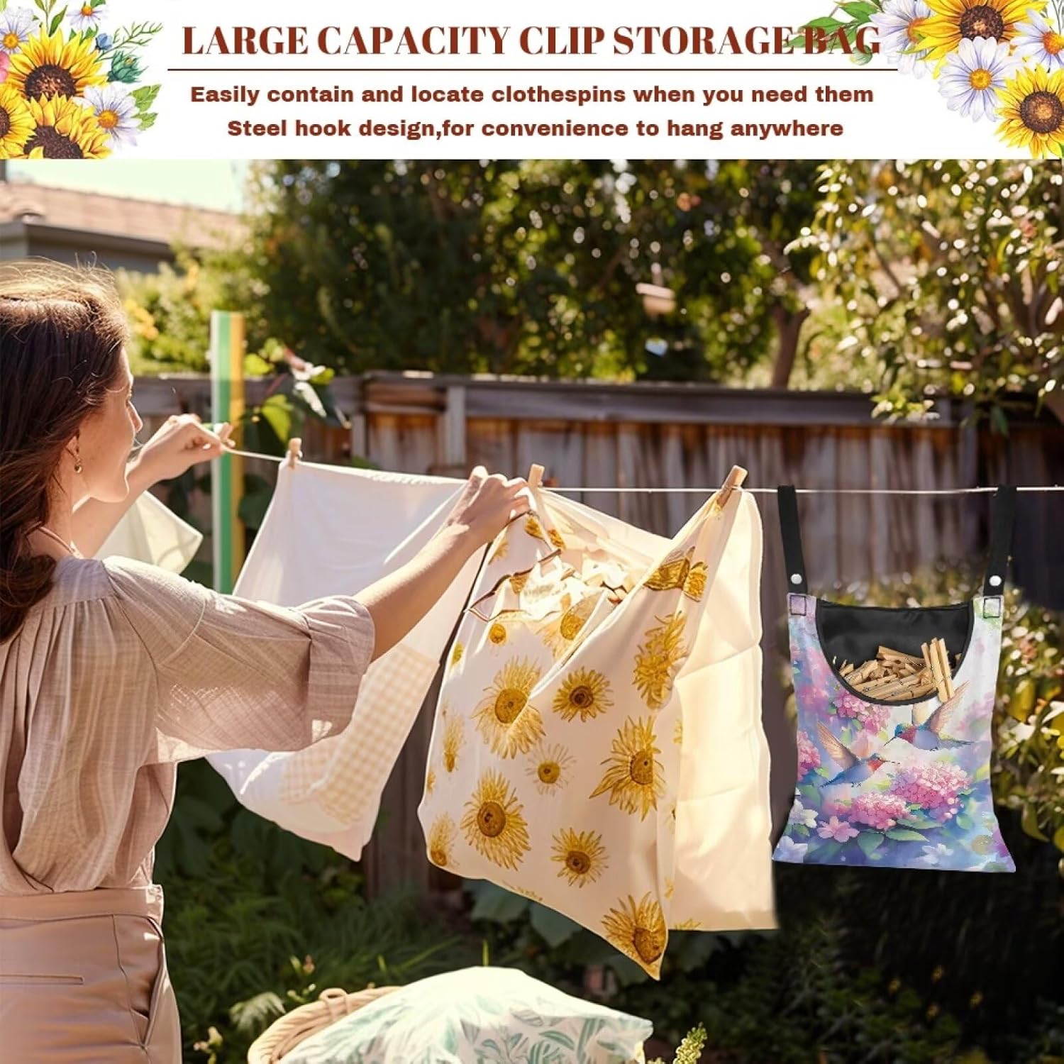 Hummingbird and Flower Clothes Pin Hanging Bag with Hanging Rope for Clothes Pins and Clothespins - Heavy Duty Outdoor Use 14.5 X 12 Inch Clothespin Bag