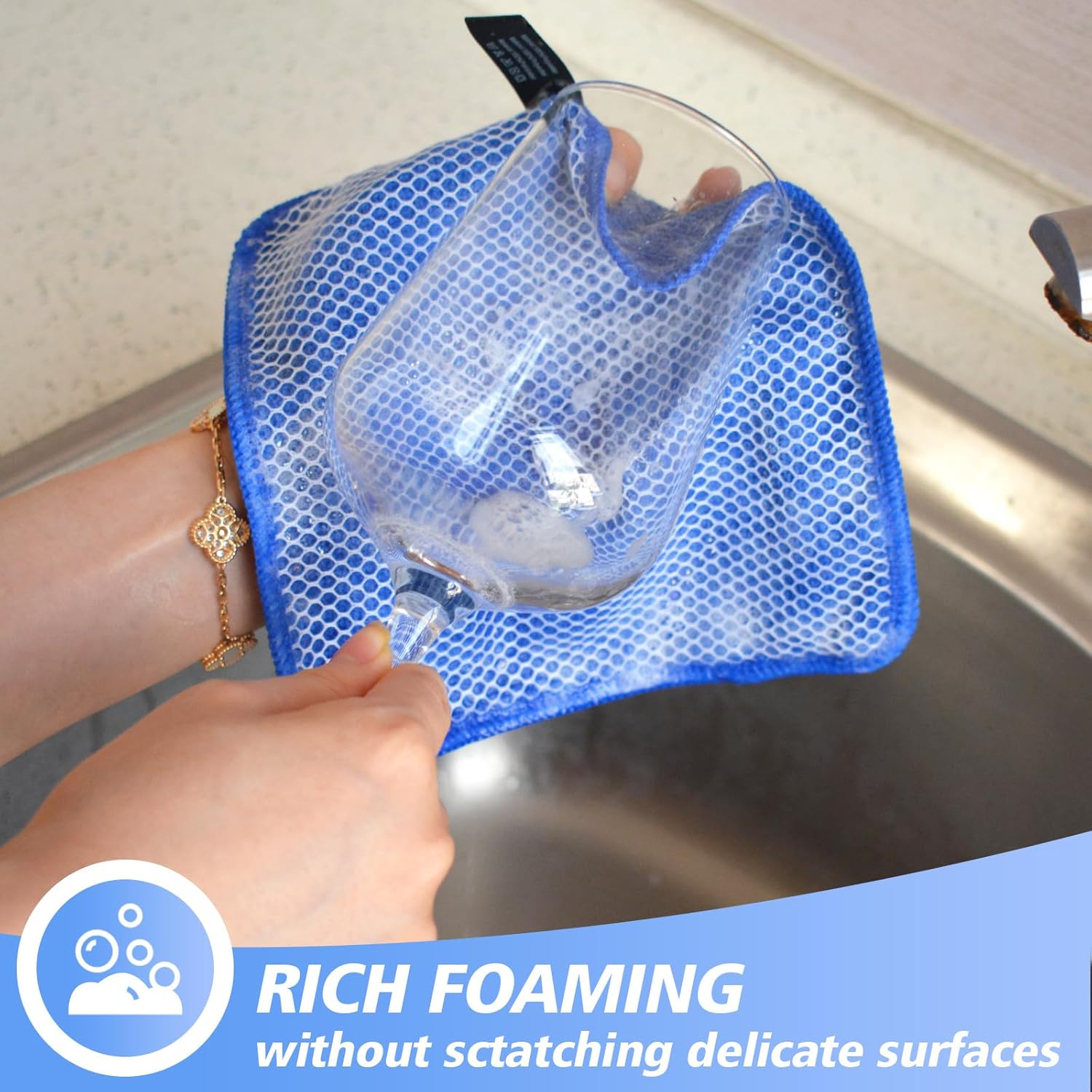 - DISH RAGS FOR KITCHEN CLEANING WITH POLY SCOUR SCRUBBING SIDE: One side is microfiber and the other side is mesh. The microfiber side works well at getting finger spots off the stainless steel appliances and the glass front of fridge or stove, microwave; the scrubby side is good for cleaning stuck on food without having to grab your scraper and does not scratch delicate surfaces either