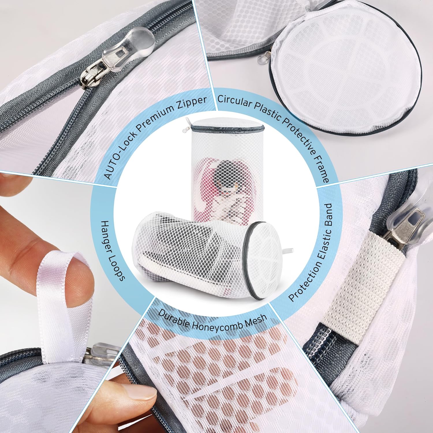 - Specialized Shoe Laundry Bags: Cylindrical shape for a perfect fit, offering optimal protection for your shoes. Made with heavy-duty honeycomb mesh for long-lasting use and durability. Includes 2 Pcs in 2 sizes (L & XL) to fit all shoe sizes, delicates, and socks. Recommendation: For oversized shoes, place one shoe per washing bag.