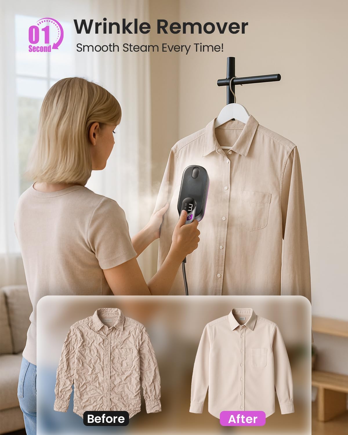 - [9-Sec Heat Up, 10 Mins of Steam]: Our steamer for clothes delivers 1000W, 120V high-performance steaming with a 9-second rapid preheat. Upgraded triple nano-steam (0.01mm) penetrates 3× deeper for stubborn wrinkles, removing them in just 30 seconds. Enjoy 10 minutes of continuous steam to refresh multiple garments quickly—perfect for busy mornings, last-minute touch-ups, or travel