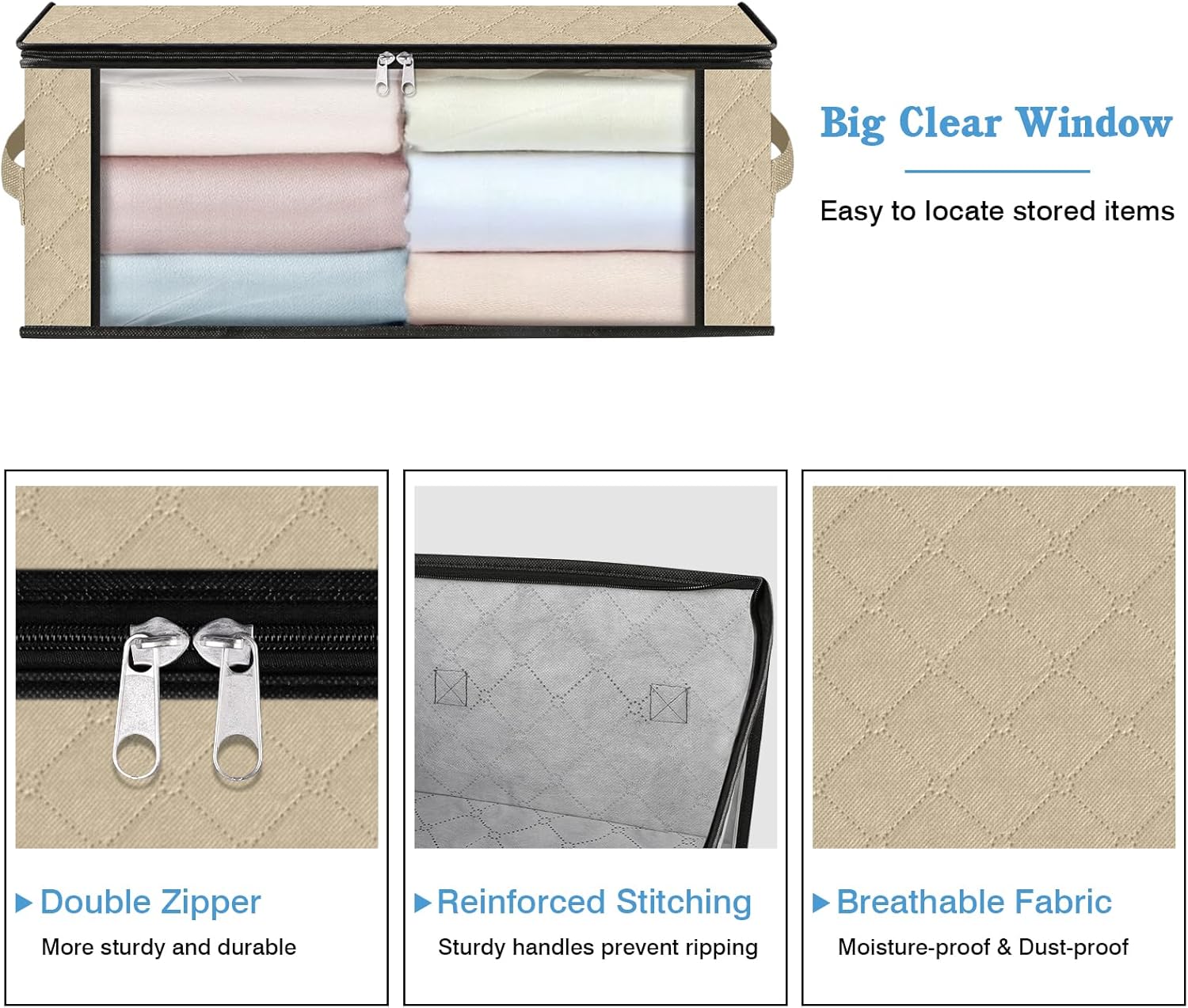 HomeHacks Storage 4-Pack Clothes Organizer Storage Bags Foldable Storage Box with Large Clear Window Sturdy Handles for Closet, Dorm, Pillows, Bedding, Clothes, Blankets, 35L, Beige