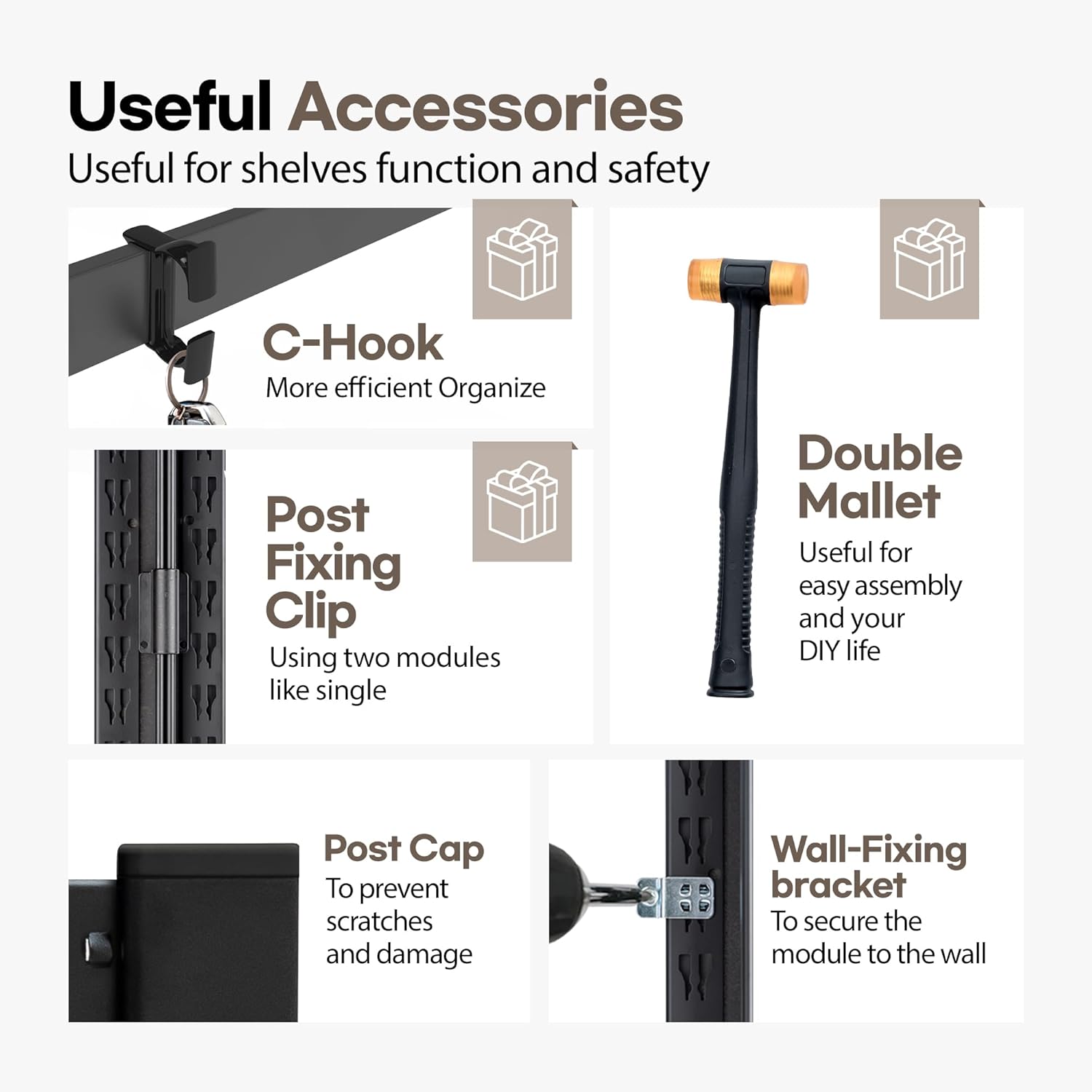 - UNIQUE BENEFIT OF ONLY HOMEDANT - You can make shelves as the basic flat shelf, rimmed basket-style shelf, or shelf blended with two (Basic flat+ basket). So you can load various types of things. Provide all purchasing customer special gift(Urethane Mallet, C-Hook, Post Fixing Clip, Wall Fixing Bracket) Provides assembly manual & videos to help you understand easier.