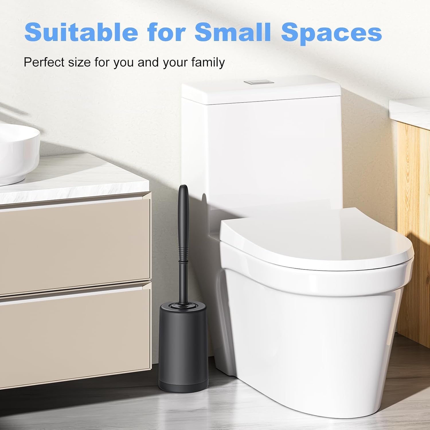 - CONVENIENT STORAGE: Our toilet brush and holder set has compact size and very space-saving, whether in the apartment or RV will not take up too much space for you, fit into all kinds of small bathroom. When you don't use it, just turn the holder to hide it and keep your bathroom neat and tidy. Nice bathroom necessities and supplies for modern homes