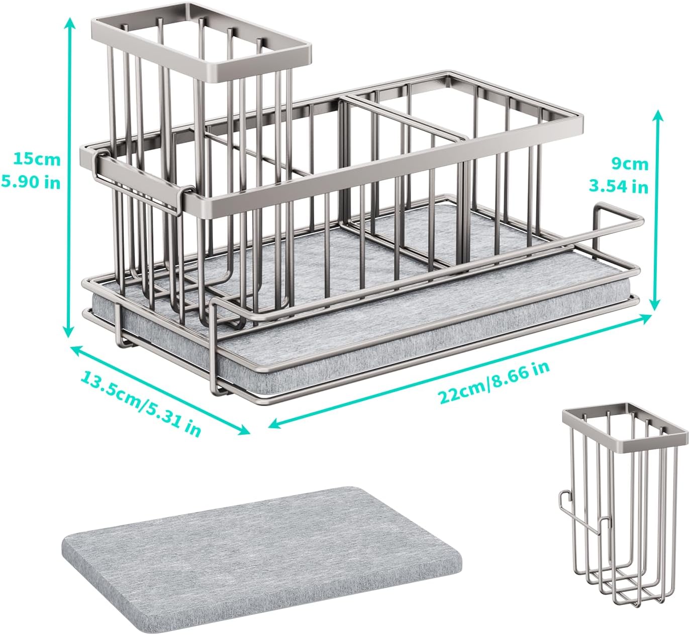 - [Save Space]: Our sink caddy kitchen sink organizer measures 8.66×5.31×3.54 inches (L × W × H). Its decent capacity allows it to hold your kitchen essentials without taking up too much space