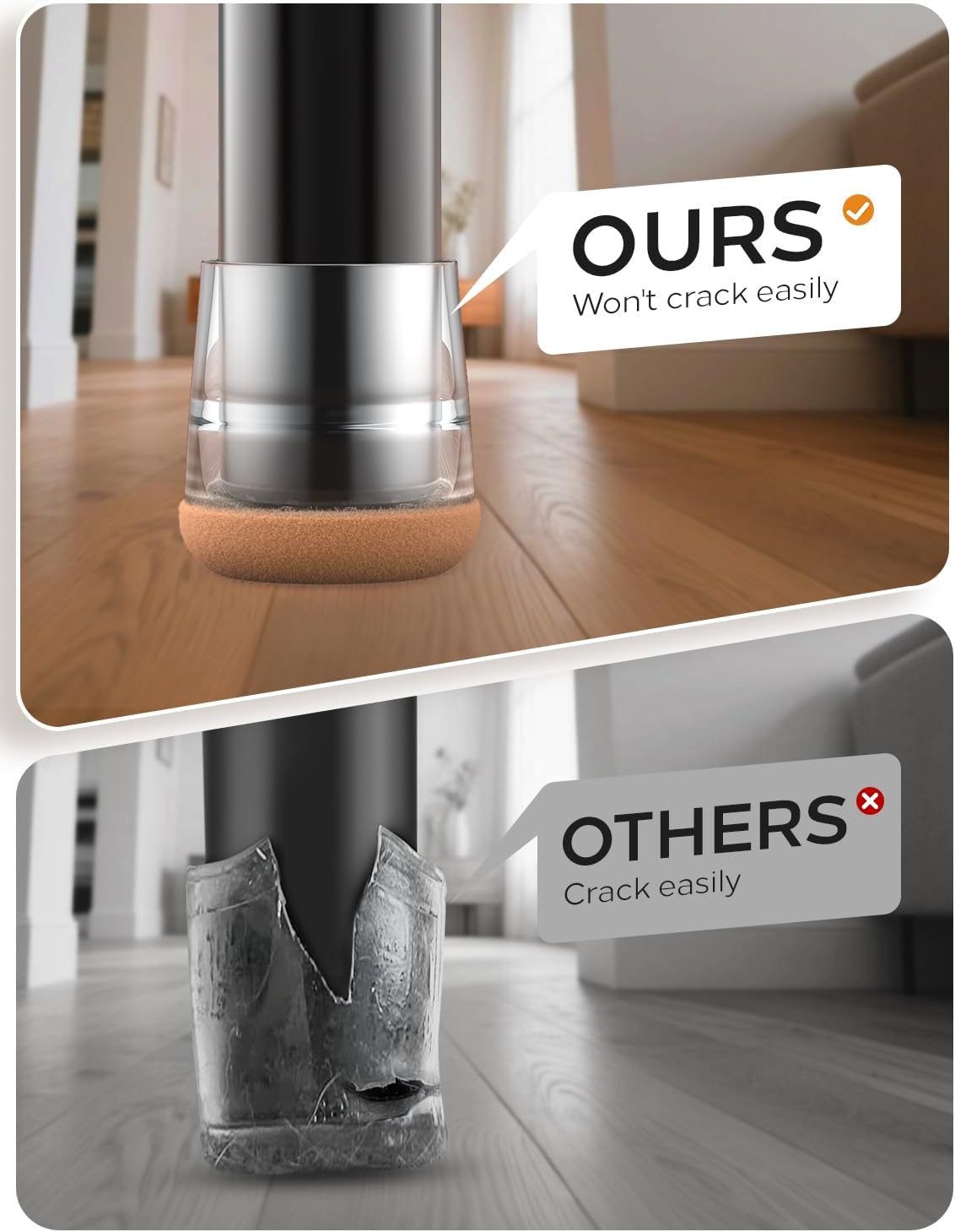 - 360° Felt-Bottom floor protectors- 360 ° fully wrapped felt design. Made from high-density industrial felt and flexible silicone to withstand daily wear, heavy chairs, and frequent movement without tearing or flattening, ensuring long-lasting floor protection.