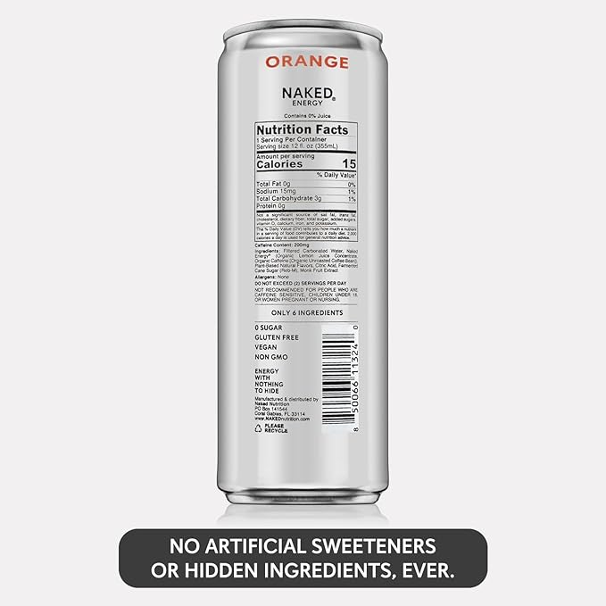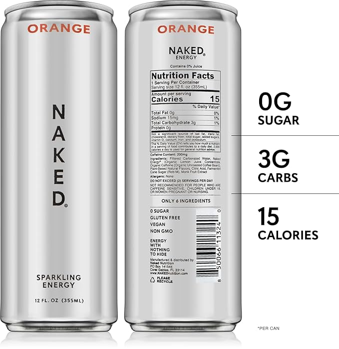 Naked Sparkling Energy Drink - Orange, Organic Caffeine, Organic Lemon Juice, Zero Sugar, No Sucralose, Naturally Sweetened, Natural Energy Drinks, Vegan, Gluten-Free, Non-GMO - 12oz Cans (Pack of 12)