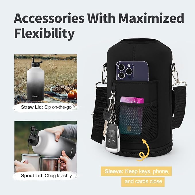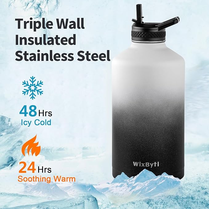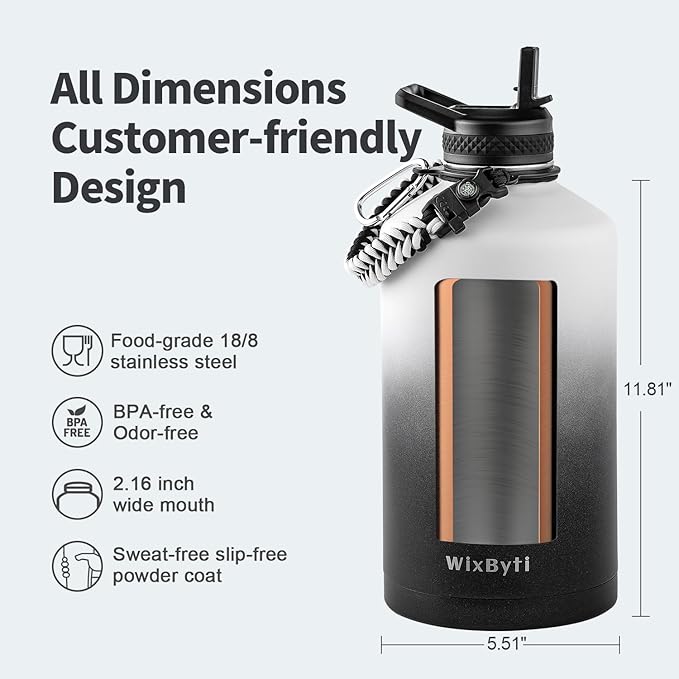 - After Services and Package: We offer continuous after-sales service against leakage and poor cold/hot-keeping capability, we are committed to 100% customer satisfaction. Your purchase includes: WixByti 128oz Water Bottle, Carrying Pouch with Adjustable Strap, Straw Lid with 2 Straws & 1 Straw Brush, Spout Lid, Paracord Handle, Water Bottle Stickers