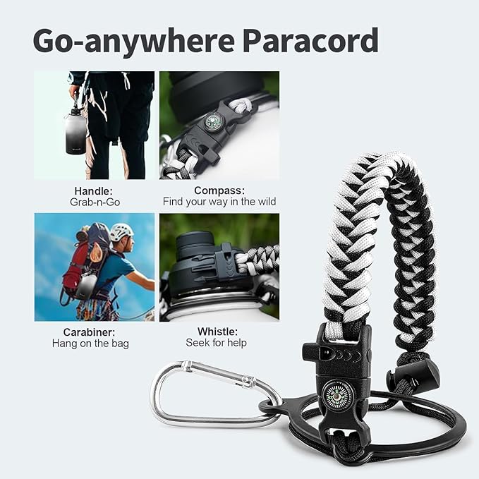 - Palm Fitting Paracord Handle: Compared to handle lids, nylon paracord on the bottle gives you more choices in terms of color coordination and coziness on your hands. Match the handle with your bottle to make a complete outdoorsy look. Compass and carabiner can be lifesavers for hiking and other expeditions
