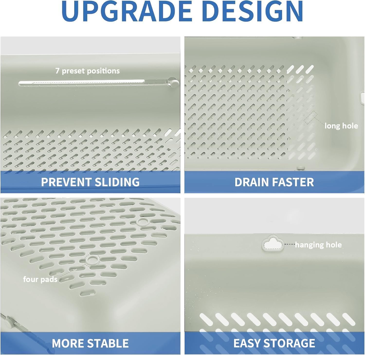 - LASSHSWA upgrade the colander, 7 preset positions - PREVENT SLIDING, long hole - DRAIN FASTER, four pads - MORE STABLE, hanging hole - EASY STORAGE.