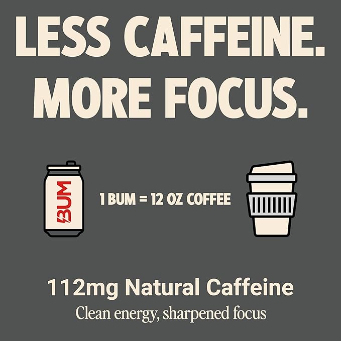 - Keep It Clean: Leave the drinks that contain a laundry list of ingredients in the past. Bum Energy contains just two simple ingredients, 112mg of Natural Caffeine & 250mg of Cognizin. Made with zero sugar and no artificial colors, every sip unlocks pure, untapped potential.