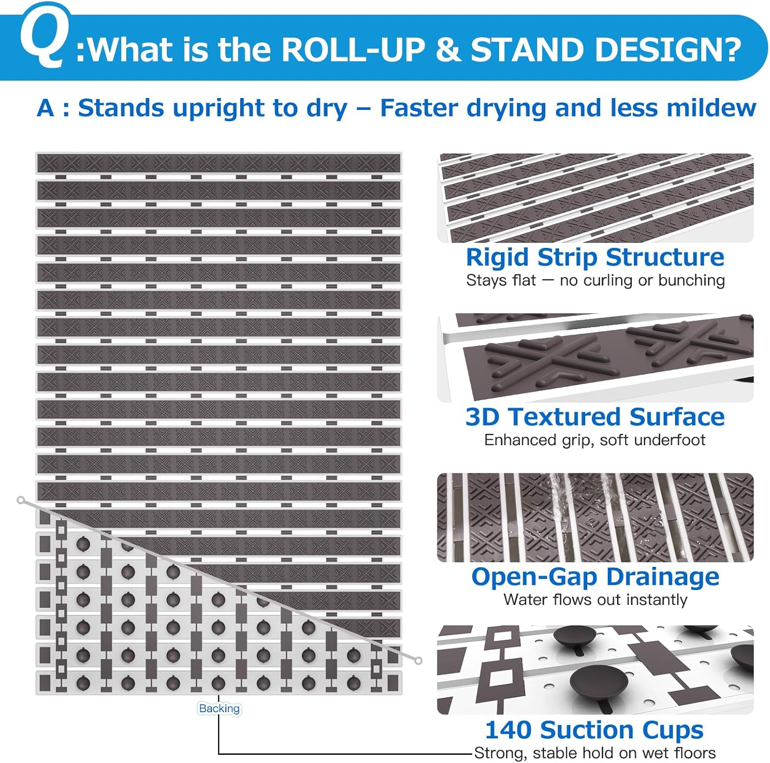 - ✅【Fast Drainage & Upright Drying】Unique drainage holes prevent water from pooling, while the roll-up design allows the mat to stand upright after use — promoting faster drying and better hygiene.