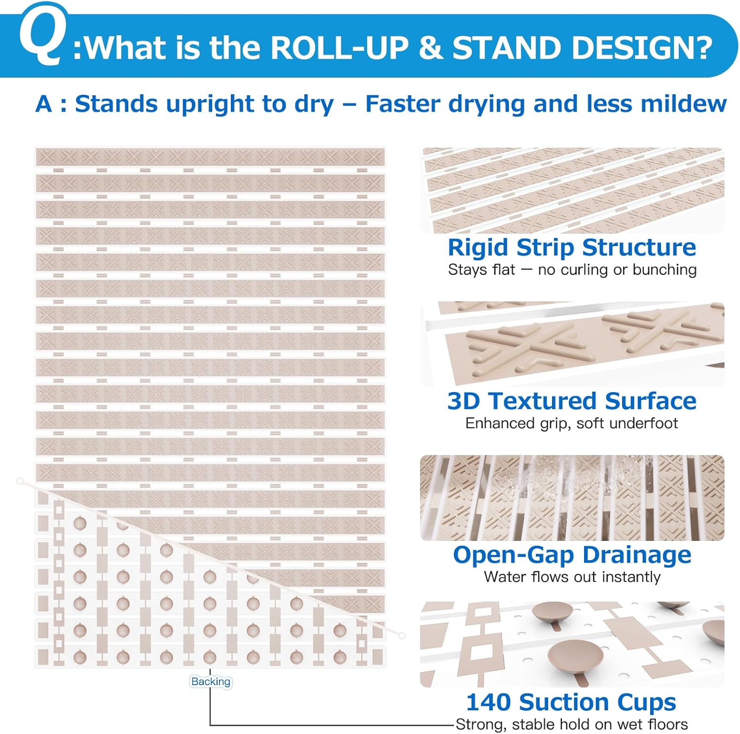 - ✅【Fast Drainage & Upright Drying】Unique drainage holes prevent water from pooling, while the roll-up design allows the mat to stand upright after use — promoting faster drying and better hygiene.