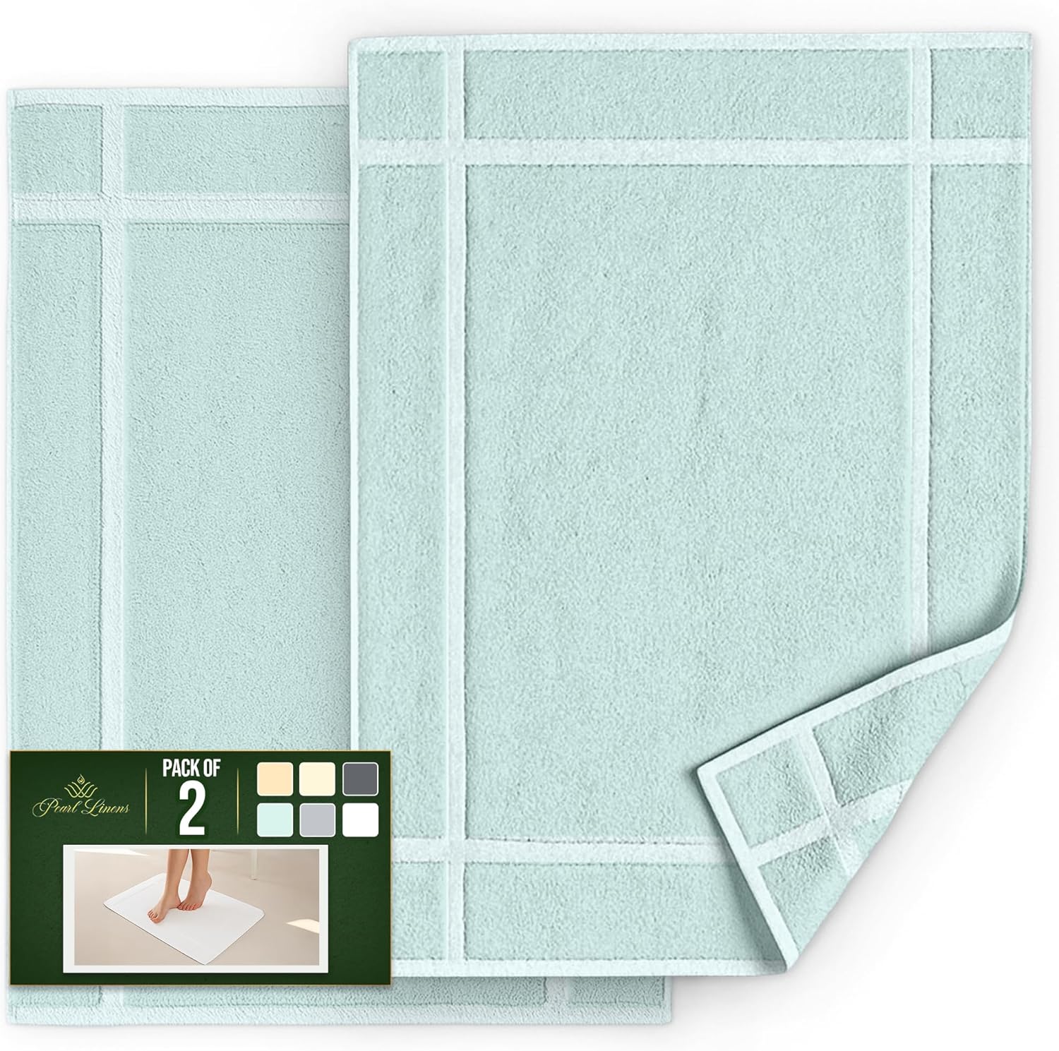 Pearl Linens Pack of 2 100% Cotton Bath Mat 18x25 inches, Soft & Absorbent Quick Dry Bathroom Mat Set, Not Bathroom Rugs, After Shower Mat, Bath Tub Mat, 687 GSM, Machine Washable, Mint Green