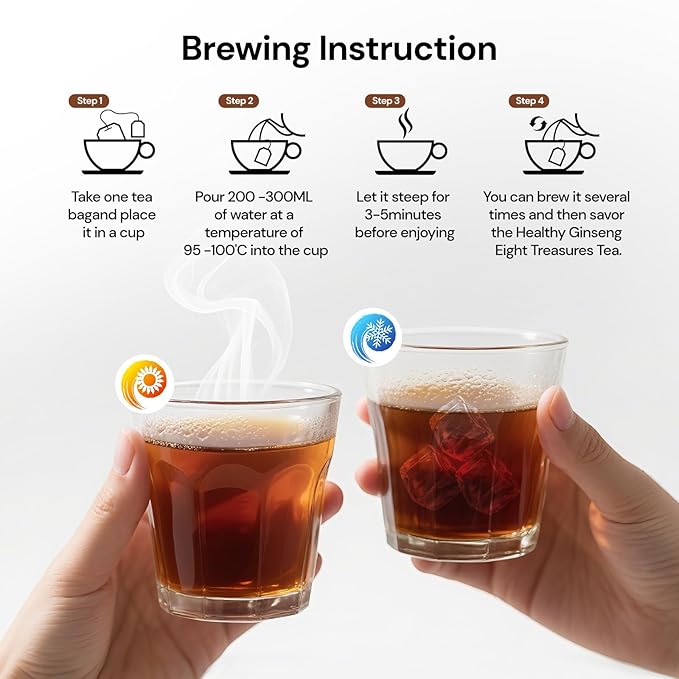 - Ginseng Eight Treasures Tea:Ginseng and Wolfberry Tea has a mellow taste, you can smell the aroma of jujubes and goji berries after steeping, and the tea broth is dark in color and excellent in quality. Naturally caffeine free, it can be consumed at any time of the day