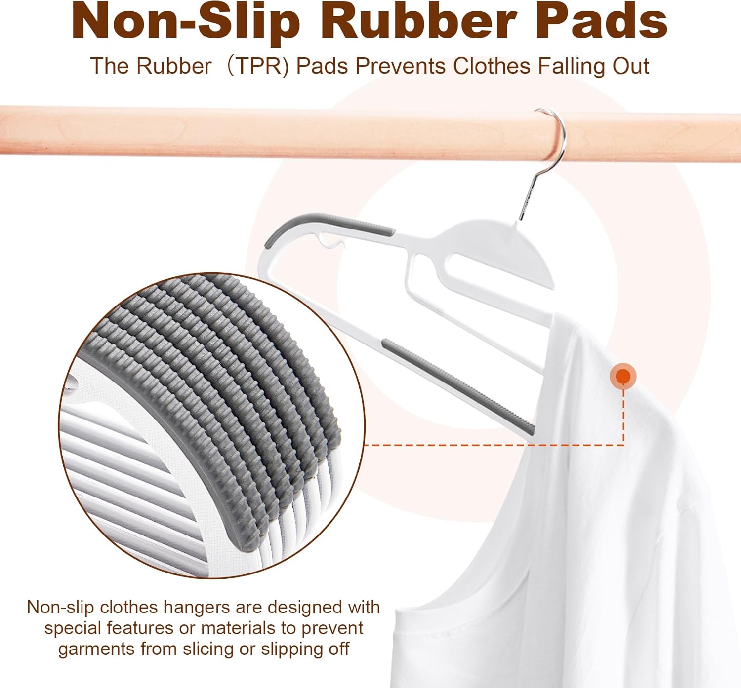 - Non Slip Pads – TPR, a plastic-rubber blend with firm grip and balanced flexibility, is used on the shoulders and bottom bar of our plastic coat hangers to keep clothes securely in place. No more slipping, our non slip hangers are a must-have for your closet
