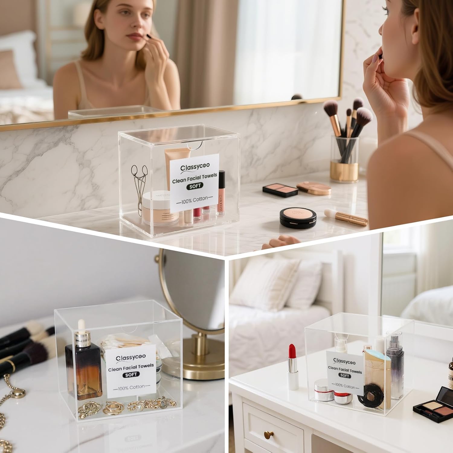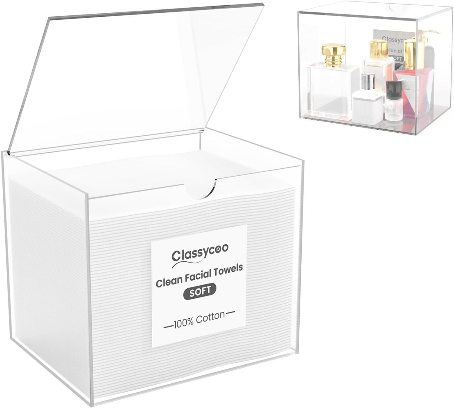 - Multi-Purpose Clear Organization: The waterproof bathroom box blocks dust in the air, keeps the face towel clean and dry in the bathroom. Also stores face washcloths, makeup remover pads, or cotton swabs. Space-saving for drawers, vanities, and countertops.