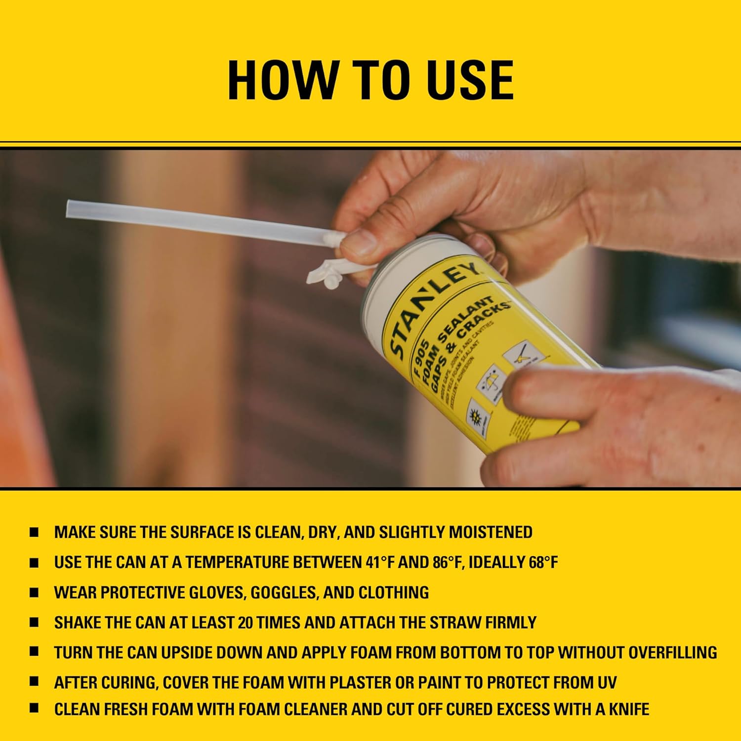 - VERSATILE EXPANDING FOAM SPRAY: Stanley F905 is a polyurethane foam formulated to fill and seal gaps, cracks, and cavities up to 3 inches wide. Designed for DIYers and pros alike, it's ideal for use around windows, doors, pipes, and wall penetrations.
