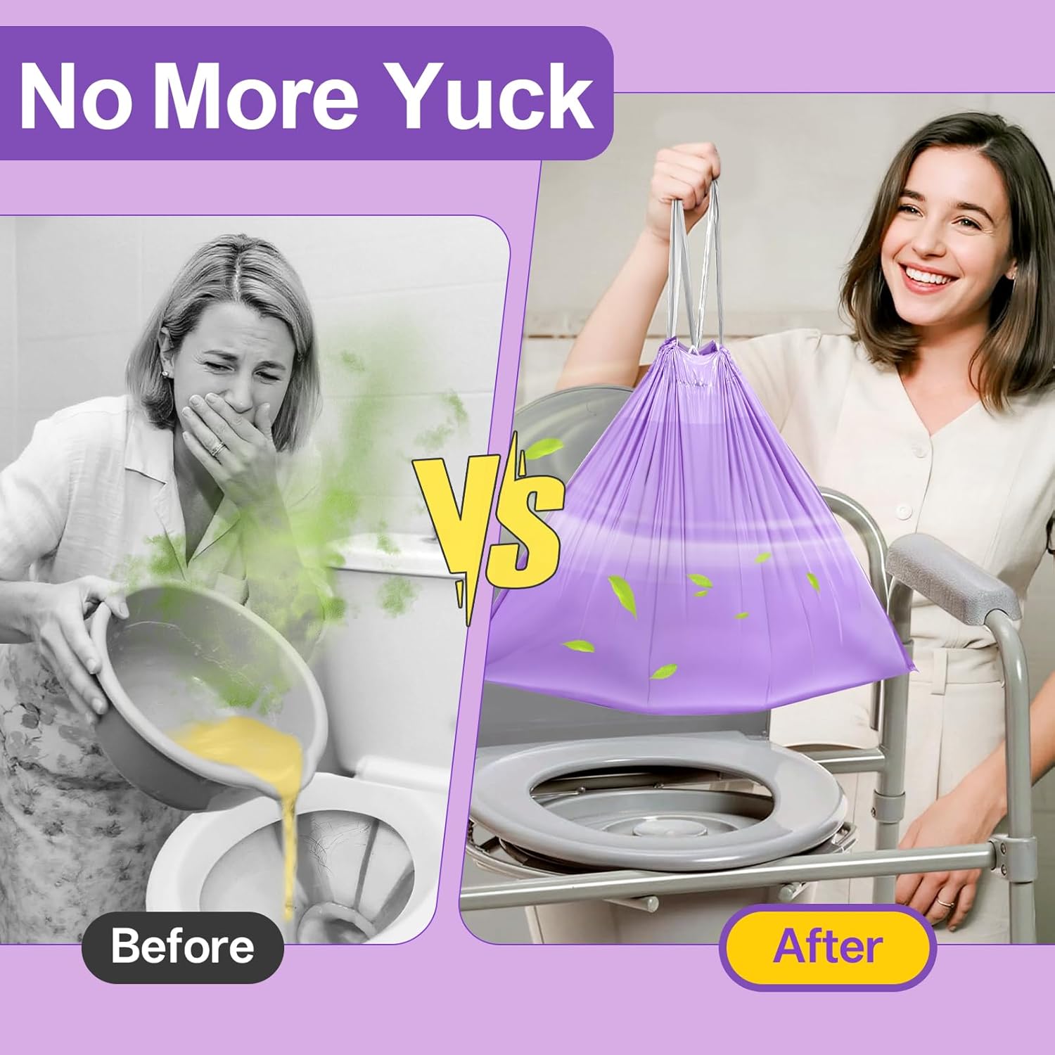 - 【Easy to Use】Disposable commode liners are designed with a sturdy drawstring. After use, just pull the drawstring, tie the bag, and throw it into the trash can like an ordinary garbage bag.